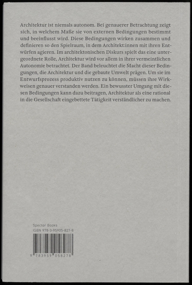Architecture is never autonomous. When you look at it more closely, the extent to which it is determined and influenced by external conditions becomes apparent. These conditions interact and combine with one another and thus define the space in which architects operate in producing their designs. In architectural discourse, this plays a subordinate role—architecture is viewed, first and foremost, in terms of its perceived autonomy. This book sheds light on the power of these conditions, which inform architecture and shape the built environment. Their productive involvement in the design process requires a precise understanding of their mechanisms. Dealing with them consciously can help to make architecture more comprehensible as an activity that is rationally embedded in society.