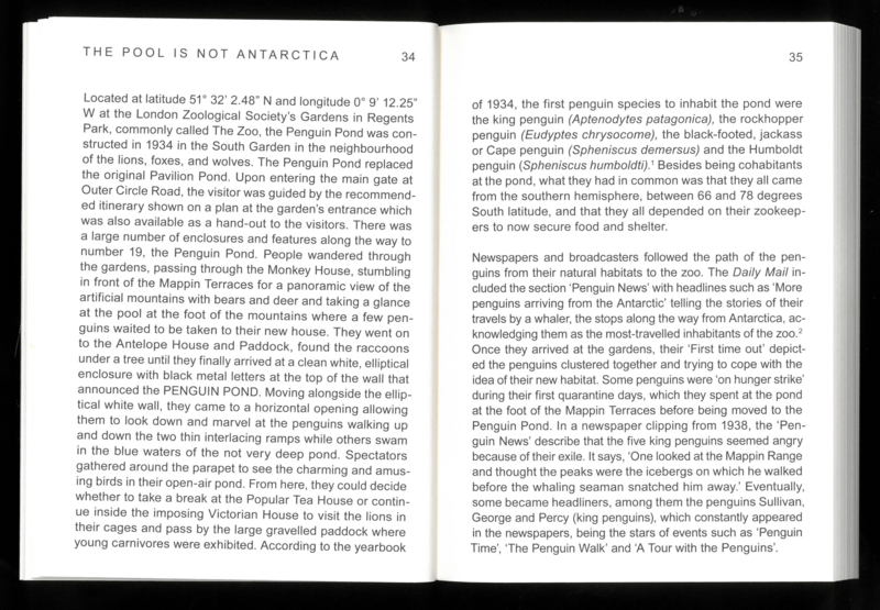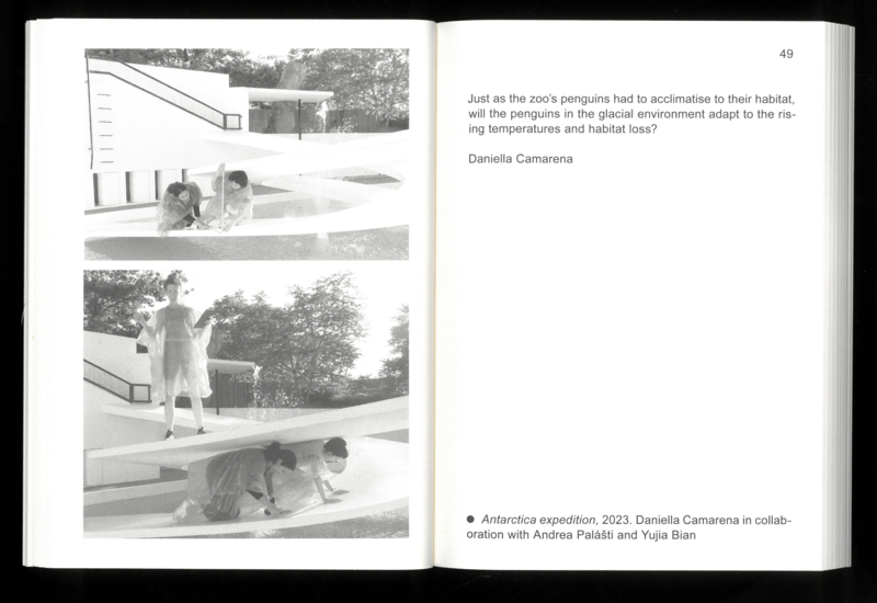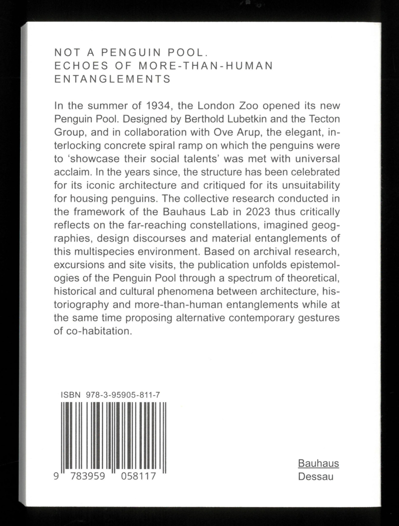 In the summer of 1934, the London Zoo opened its new Penguin Pool. Designed by Berthold Lubetkin and the Tecton Company, in collaboration with Ove Arup, the elegant, interlocking concrete spiral ramps on which the penguins “showcase their social talents” was met with universal acclaim. In the years since, the structure has been celebrated for its iconic architecture—and has justly been criticized for its inadequacy when it comes to housing penguins. The collective research conducted in the framework of the Bauhaus Lab in 2023 critically reflects on the far-reaching constellations, geographical imaginaries, design discourses and material entanglements of this multi-species environment. Based on archival research and excursions, the publication unfolds multiple epistemologies of the Penguin Pool through a spectrum of theoretical, historical and cultural phenomena straddling the realms of architecture, historiography and more-than-human entanglements, while at the same time proposing contemporary gestures of co-habitation.