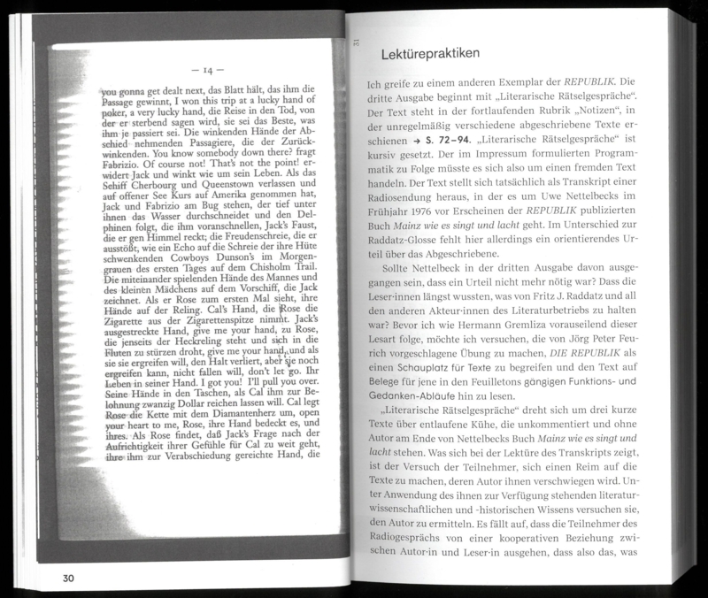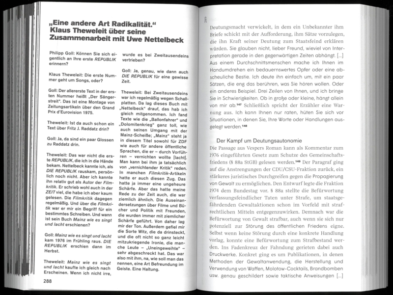 In 1976, the film critic, court reporter, and music producer of the Krautrock band Faust, Uwe Nettelbeck, began editing the magazine DIE REPUBLIK, soon joined by his partner, the well-known television announcer and actress Petra Nettelbeck, as co-editor. Western Dissidence presents, through selected readings and archival materials, a magazine emerging from the 1968 movement that styled itself as an outlaw to the left-alternative literary scene of the time. The book traces the rise of a form of literary production shaped by patterns of popular-cultural perception—one that unfolded outside the spectacular proclamations of Pop. Against the historical backdrop of the German Autumn, unexpected dissident forms of literary resistance come to the fore. Interviews with readers and contributors—including Gisela Stelly Augstein, Klaus Theweleit, among others—accompany the readings and offer insight into the network surrounding DIE REPUBLIK, which bridged the counterculture and the establishment of the Federal Republic of Germany.