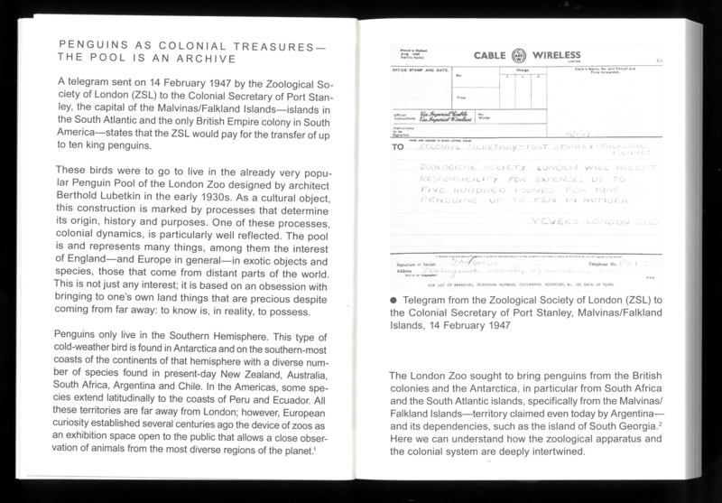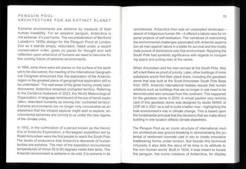 In the summer of 1934, the London Zoo opened its new Penguin Pool. Designed by Berthold Lubetkin and the Tecton Company, in collaboration with Ove Arup, the elegant, interlocking concrete spiral ramps on which the penguins “showcase their social talents” was met with universal acclaim. In the years since, the structure has been celebrated for its iconic architecture—and has justly been criticized for its inadequacy when it comes to housing penguins. The collective research conducted in the framework of the Bauhaus Lab in 2023 critically reflects on the far-reaching constellations, geographical imaginaries, design discourses and material entanglements of this multi-species environment. Based on archival research and excursions, the publication unfolds multiple epistemologies of the Penguin Pool through a spectrum of theoretical, historical and cultural phenomena straddling the realms of architecture, historiography and more-than-human entanglements, while at the same time proposing contemporary gestures of co-habitation.
