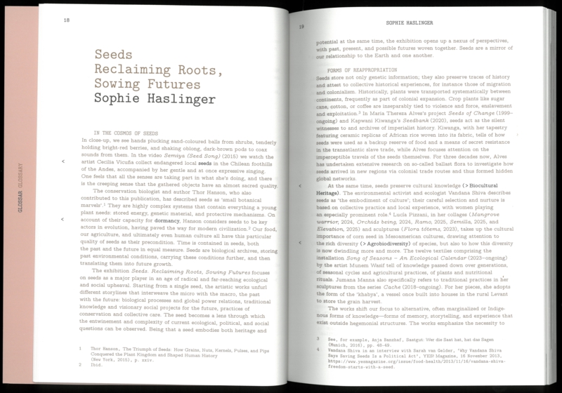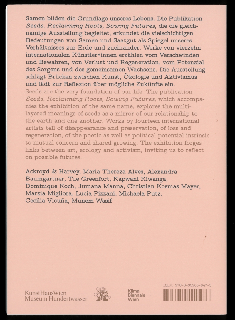 Seeds provide us with food and raw materials, preserve diversity and knowledge, and represent hope and renewal. They form the very foundation of our lives. The publication Seeds: Reclaiming Roots, Sowing Futures, which accompanies the exhibition of the same name, explores the multifaceted significance of seeds as a mirror of our relationship to the Earth and to one another. Works by international artists tell stories of migration and colonialism, indigenous knowledge, biodiversity, agriculture, resistance, and regenerative futures. The exhibition bridges the gap between art, ecology, and activism, offering new perspectives on the potential of care and collective growth.