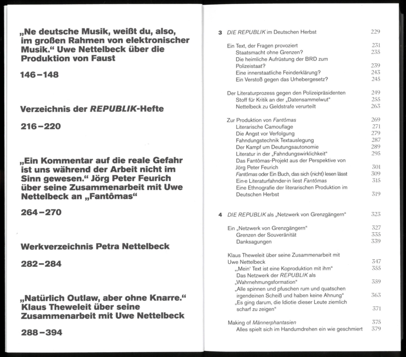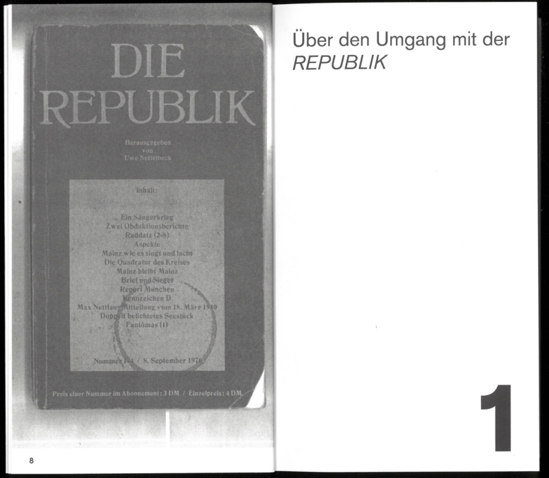 In 1976, the film critic, court reporter, and music producer of the Krautrock band Faust, Uwe Nettelbeck, began editing the magazine DIE REPUBLIK, soon joined by his partner, the well-known television announcer and actress Petra Nettelbeck, as co-editor. Western Dissidence presents, through selected readings and archival materials, a magazine emerging from the 1968 movement that styled itself as an outlaw to the left-alternative literary scene of the time. The book traces the rise of a form of literary production shaped by patterns of popular-cultural perception—one that unfolded outside the spectacular proclamations of Pop. Against the historical backdrop of the German Autumn, unexpected dissident forms of literary resistance come to the fore. Interviews with readers and contributors—including Gisela Stelly Augstein, Klaus Theweleit, among others—accompany the readings and offer insight into the network surrounding DIE REPUBLIK, which bridged the counterculture and the establishment of the Federal Republic of Germany.