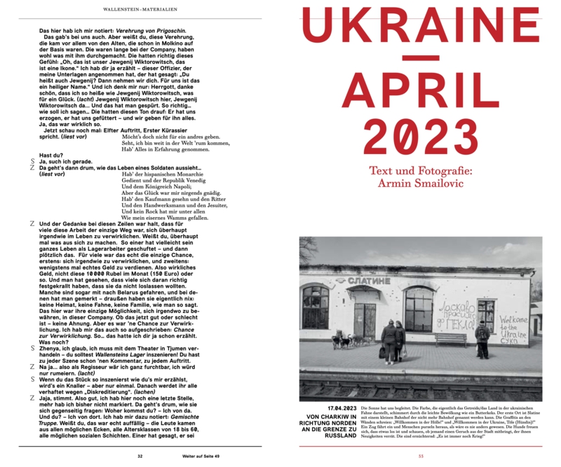 Schillers Wallenstein trifft auf die Gegenwart: Ein Programmheft wie ein Schlachtfeld. Zwischen Collage und Recherche, zwischen Schiller-Pathos und Stimmen aus der Ukraine entsteht ein vielstimmiges Echo über Krieg, Macht und Erinnerung. Texte von Friedrich Schiller, Swetlana Alexijewitsch und vielen anderen prallen auf Fotografien von Armin Smailovic, Dokumente, Fundstücke und Essays. Die Publikation zu Jan-Christoph Gockels Inszenierung Wallenstein. Ein Schlachtfest in sieben Gängen an den Münchner Kammerspielen ist kein Beiheft, sondern ein Lesebuch – ein wilder Mix aus Literatur, Politik und Geschichte, der zeigt: Der Krieg hört nicht auf, er nährt sich selbst.