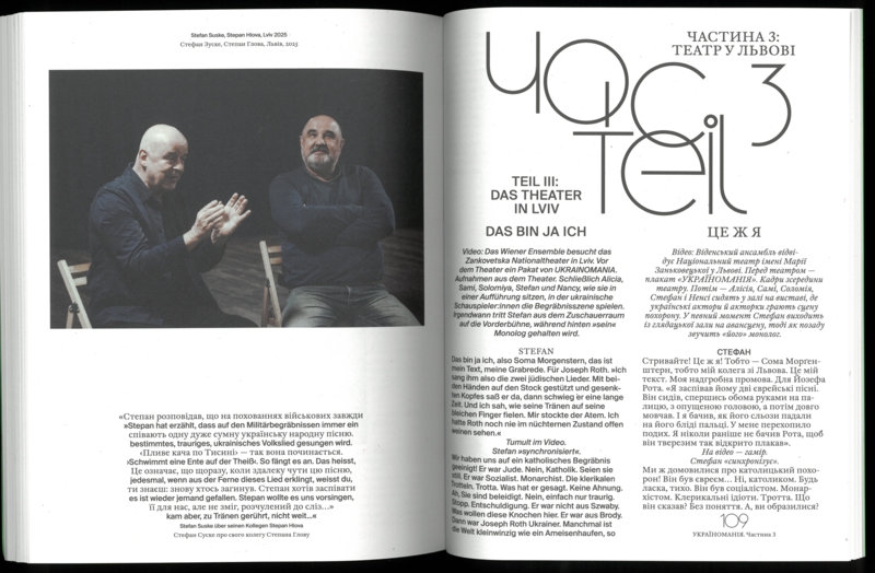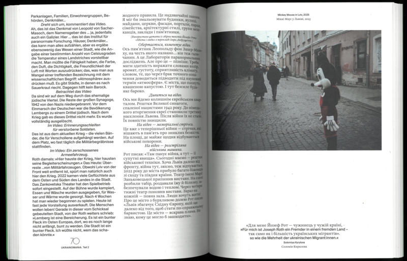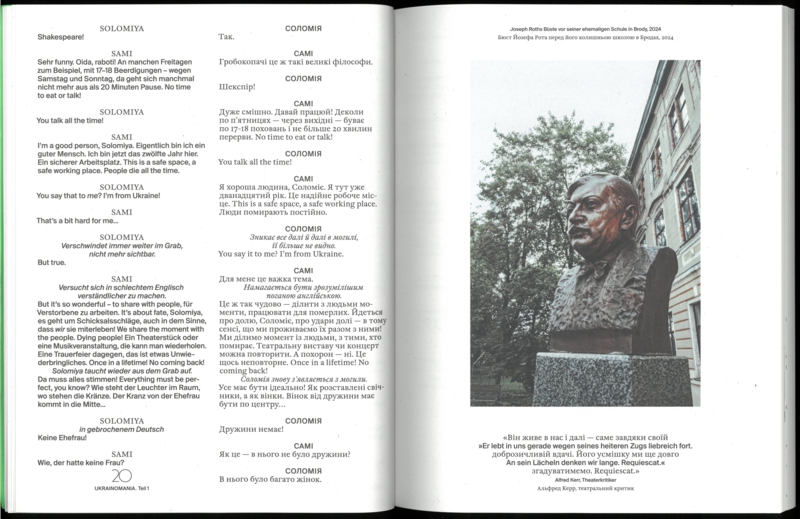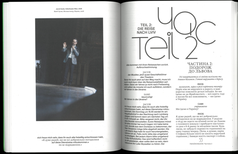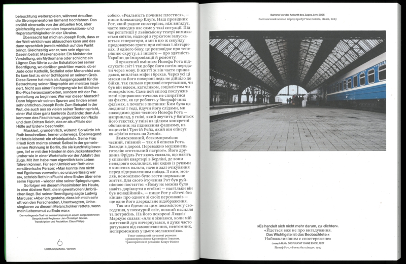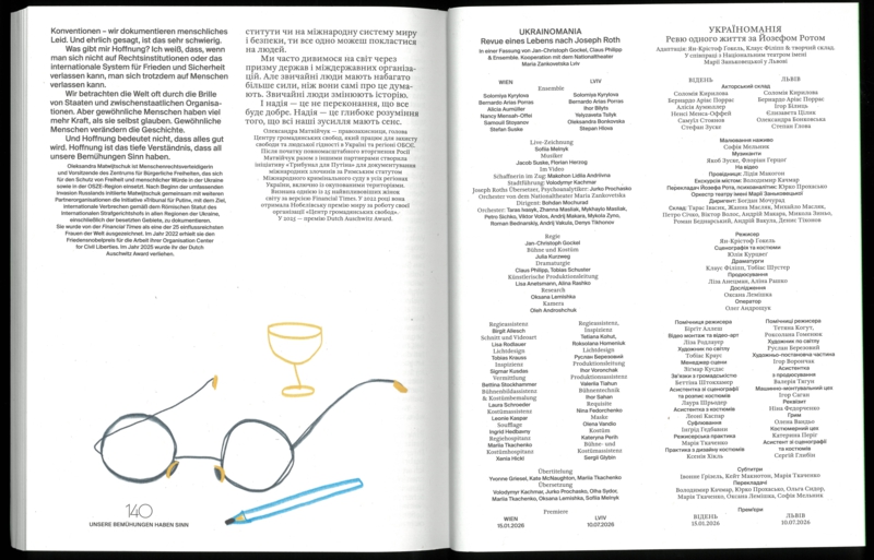 Mitte der 1920er Jahre besuchte Joseph Roth seine alte Heimat Lviv, damals Lemberg, und das galizische Umland, in der heutigen Ukraine gelegen. Schon ein paar Jahre zuvor hatte der 1894 im überwiegend jüdisch geprägten Brody geborene Schriftsteller und Reporter in der Berliner Zeitung geschrieben: „Manchmal wird eine Nation modern. Nun sind es die Ukrainer.“ Gut 100 Jahre später reist das Volkstheater auf Roths Spuren nach Lviv und zeigt dort wie in Wien eine internationale Koproduktion, eine Revue gegen Krieg, Düsternis und Verzweiflung. Das vorliegende Materialienbuch dokumentiert die Reise, das Stück und seine Genese.