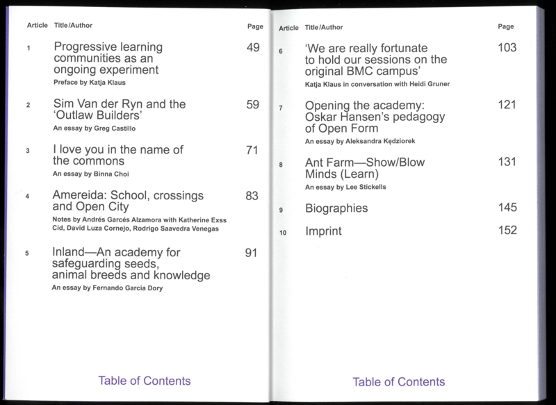 Greg Castillo ist Professor für Architekturgeschichte an der University of California in Berkeley. Binna Choi ist Kuratorin, Autorin und Organisatorin. Andrés Garcés Alzamora, Architekt, Katherine Exss Cid, Gestalterin, David Luza Cornejo, Architekt, Rodrigo Saavedra Venegas, Architekt, sind Mit- glieder der Corporación Cultural Amereida – Ciudad Abierta (Kulturvereinigung Amereida – Offene Stadt). Fernando Garcia Dory ist Künstler, Schäfer und Agrarökologe und lebt zwischen Madrid, Mallorca und den nordspanischen Bergen. Heidi Gruner ist geschäftsführende Direktorin der School of the Alternative (SotA) in Black Mountain, NC. Katja Klaus ist wissenschaftliche Mitarbeiterin der Akademie der Stiftung Bauhaus Dessau. Aleksandra Kędziorek ist Architekturhistorikerin, Kuratorin und Redakteurin in Warschau. Lee Stickells lehrt Architektur an der University of Sydney School of Architecture, Design and Planning.