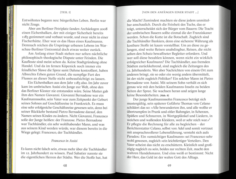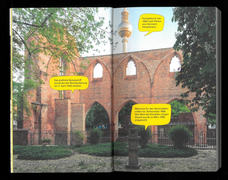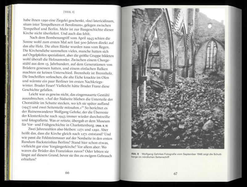 Die Ruine der Franziskaner Klosterkirche gehört zu den ältesten Baudenkmälern Berlins. Die kulturhistorische Erzählung von Kerstin Decker führt kenntnisreich durch die Zeiten, beschreibt die Gründungsjahre der Stadt und erhellt die bahnbrechenden Architekturleistungen der Erbauer genauso wie den vielfachen Wechsel der Nutzer der Klosterkirche. Durch Karten, Fotografien und Zeichnungen führt der Text in die Geschichte des Ortes ein und legt unterschiedliche Zeitschichten frei. Die Klosterkirche erlaubt eine konkrete Erfahrung der urbanen Geschichte im Stadtraum, durch den man sich mit dem Buch bewegen kann. Die Publikation wird im Wechselspiel zwischen Autorin, Bildredaktion und Gestalter als eine Art archäologische Methode und Formexperiment entwickelt, so dass jenseits der eingespielten Routinen von Stadtführern ein lebendiger Umgang mit Stadt und ihrer Geschichte entsteht.